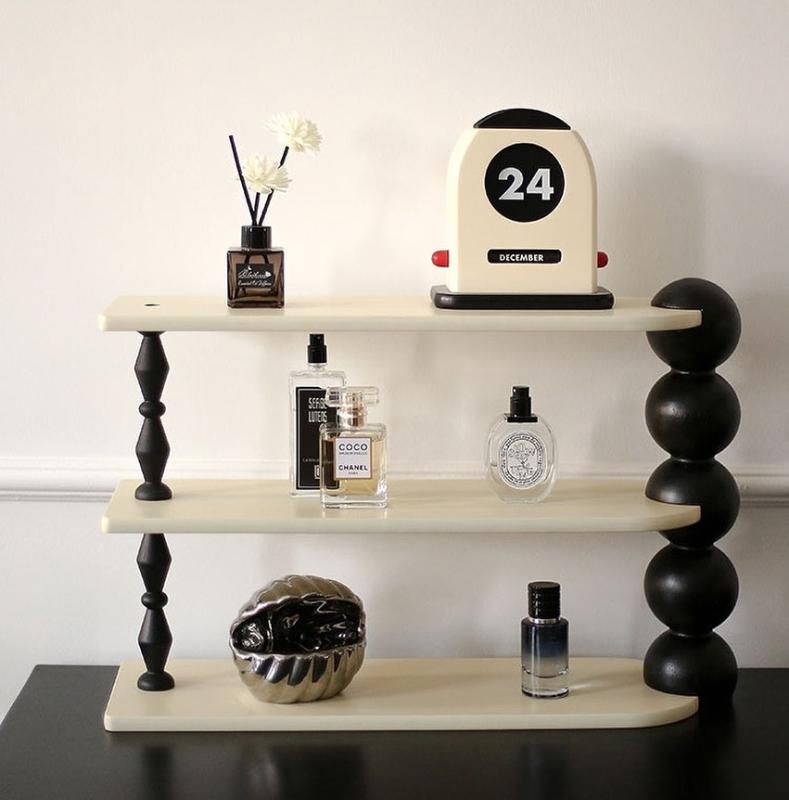 아이보리 바탕과 양 옆 각각 유니크한쉐입의 블랙 기둥의 시크하면서 모던한 디자인이 눈길을 사로잡는 선반입니다.