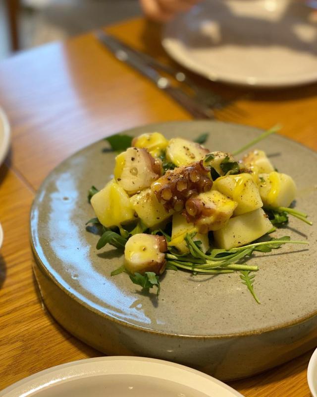 장시간 저온조리한 문어에 감자,루꼴라,레몬주스 엑스타라버전 올리브오일 샐러드 비주얼이야. 문어도 쫄깃하고 감자도 알맞게 익어서 전체적인 식감이 다양해. 레몬드레싱과 올리브오일과 루꼴라의 조합도 좋아.산뜻한 풍미야.